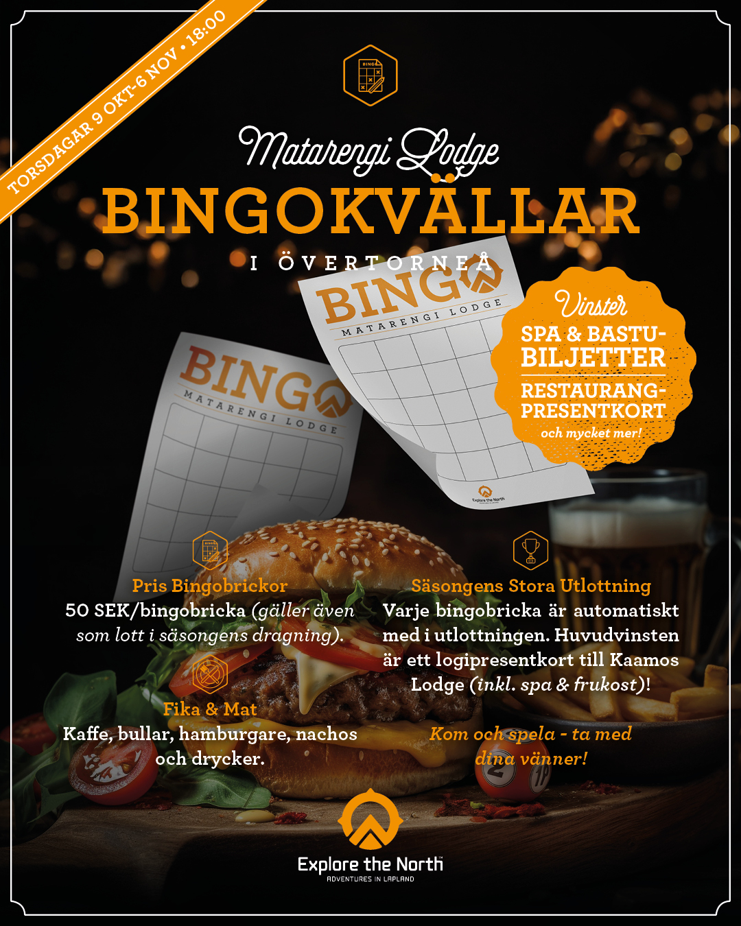 okt 16 2025-10-16 kl. 18:00 - 2025-11-06 kl. 17:00 Bingo på Matarengi Lodge Matarengi Lodge Sockenvägen 1 Evenemang detaljer Få vägbeskrivningar