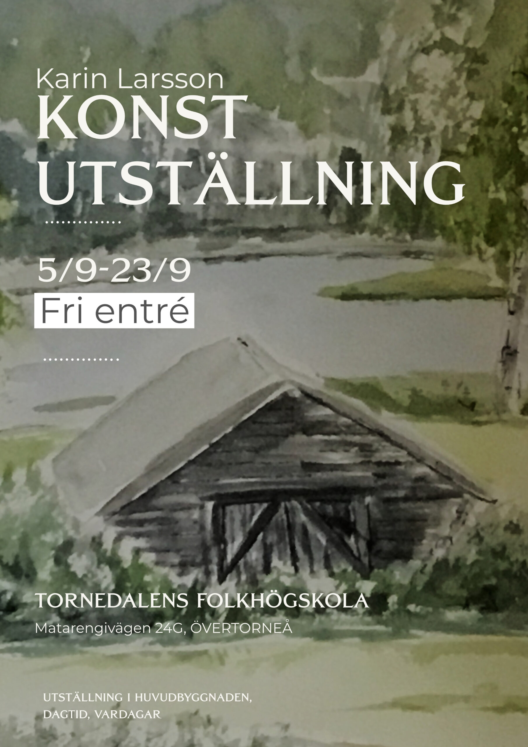 Utställning i huvudbyggnaden, Matarengivägen 24G, dagtid, vardagar.